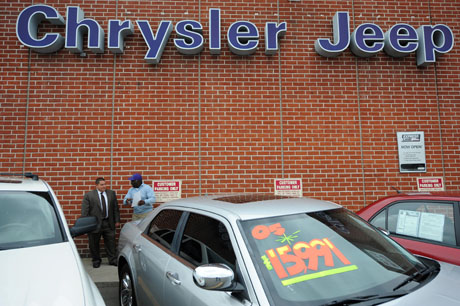 9日,在美國(guó)加利福尼亞州格倫代爾的一家克萊斯勒經(jīng)銷處,一名顧客(右)和銷售人員交談。美國(guó)最高法院當(dāng)日做出裁決,允許意大利汽車廠商菲亞特收購(gòu)美國(guó)汽車巨頭克萊斯勒股份。此前最高法院曾因退休基金持有者上訴而叫停汽車業(yè)巨頭克萊斯勒破產(chǎn)重組的并購(gòu)程序。意大利菲亞特汽車公司10日已就收購(gòu)美國(guó)克萊斯勒汽車公司資產(chǎn)正式達(dá)成交易。