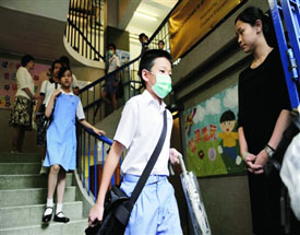 6月11日,香港北角一家小學(xué)的學(xué)生戴著口罩離開學(xué)校。 當(dāng)日,香港特區(qū)行政長官曾蔭權(quán)與香港特區(qū)政府大流感應(yīng)變督導(dǎo)委員會(huì)舉行會(huì)議后表示,香港圣保祿學(xué)校有12名學(xué)生確診感染甲型H1N1流感,香港已出現(xiàn)集體感染個(gè)案,因此做出全港小學(xué)、幼兒園及特殊學(xué)校停課決定。