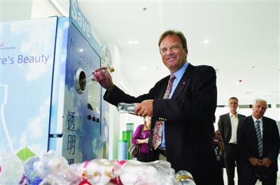 6月17日,德國(guó)OHL公司北京代表處的貝恩克在體驗(yàn)使用飲料瓶回收機(jī)。
