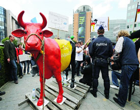 6月18日,在比利時首都布魯塞爾,奶農(nóng)在歐盟總部外示威。當日,近千名來自德國、比利時等歐盟國家的奶農(nóng)聚集在歐盟總部外舉行示威游行,要求維護奶農(nóng)的利益,阻止牛奶收購價格的進一步下跌。