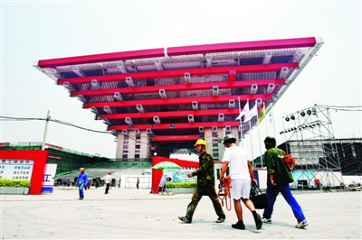 6月21日,工人從上海世博會中國館前走過。 目前,上海世博會中國館上部冠型結構外立面“紅衣”已經基本“穿戴”完畢,整個中國館外立面紅色裝飾板安裝工程預計將于7月底全部完工。據上海世博會事務協調局副局長丁浩介紹,中國館墻體最終披上的“中國紅”,象征著“熱忱、奮進、團結”的民族品格,可以視為對“中國紅”概念的經典詮釋。