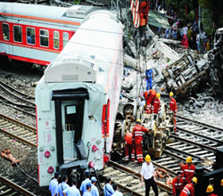 6月29日,救援人員正在現(xiàn)場奮力搶修。當(dāng)日凌晨,由長沙開往深圳的K9017次和銅仁開往深圳西的K9063次列車在湘粵邊界湖南郴州火車站內(nèi)發(fā)生側(cè)面沖撞事故,事故造成3人死亡,60余人受傷。事故發(fā)生后,救援部門緊急調(diào)來了應(yīng)急發(fā)電、照明設(shè)備和切割機(jī)、大型千斤頂?shù)染仍O(shè)備,奮力搶修清理。經(jīng)過奮力搶修清理,7時(shí)06分,京廣線上行(北上)已恢復(fù)運(yùn)行,14時(shí)25分,京廣線下行(南下)恢復(fù)運(yùn)行。至此,京廣全線基本恢復(fù)正常行車。 |