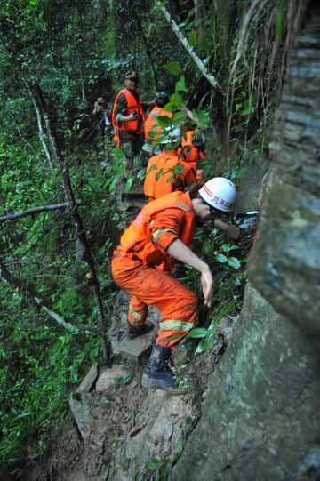 7月12日上午,重慶市搜救官兵從潭獐峽河谷左岸一處懸崖邊經(jīng)過。