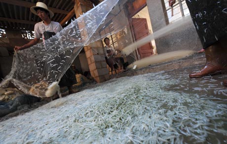 7月18日,經(jīng)過近10個(gè)月的封湖禁漁后,云南滇池開湖捕魚,周邊漁民一大早就外出捕魚,收獲頗豐。圖為滇池邊西華街村的漁民收獲銀魚。