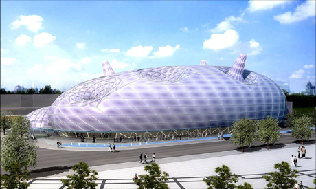 占地6000平方米的日本館,是上海世博會40個左右外國自建館中規(guī)模最大的一類。淡紫色的建筑外觀,由太陽的紅色與水的藍色融合而來;弧形穹頂?shù)男Q繭造型,取“蠶有長壽”的寓意,而從蠶繭中抽取蠶絲、織成絲絹的工藝,正是從中國傳入日本的,是中日之間“緊密連接”的象征。這是上海世博會日本館效果圖。