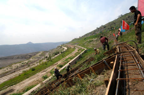 7月27日,工人們正在加固海州露天礦的礦坑圍坡,這是海州露天礦國家礦山公園建設(shè)的重點項目之一。