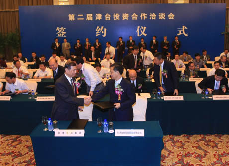 7月30日,第二屆津臺(tái)投資合作洽談會(huì)投資項(xiàng)目簽約儀式在天津舉行。此次洽談會(huì)共簽約19個(gè)項(xiàng)目,涉及津臺(tái)安全產(chǎn)業(yè)創(chuàng)意園、旺通生物科技、七里海生態(tài)農(nóng)業(yè)觀光園、直沽媽祖文化經(jīng)貿(mào)園等,投資總額達(dá)110.39億元人民幣。共有來自臺(tái)灣36個(gè)行業(yè)公(協(xié))會(huì)和232家企業(yè)的約400名工商界人士參加了為期三天的第二屆津臺(tái)投資合作洽談會(huì)。新華社發(fā) |