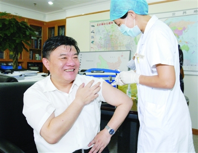 作為我國第一個甲型H1N1流感疫苗受試者,衛(wèi)生部部長陳竺8月11日下午接種第二針。(圖片來源:衛(wèi)生部網(wǎng)站)