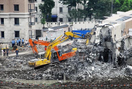 8月12日,上海市閔行區(qū)“蓮花河畔景苑”倒覆樓房拆除工作在前一段時間受阻后重新開始。8月11日,“蓮花河畔景苑”開發(fā)商———上海梅都房地產(chǎn)開發(fā)有限公司表示,7號樓拆除后不再重建,原址計劃增建公共設(shè)施,改善環(huán)境、降低容積率。新華社發(fā)
