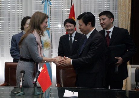 中國和阿根廷企業(yè)代表8月14日簽署采購協(xié)議,中國向阿根廷采購農(nóng)產(chǎn)品的金額超過一億美元。出席簽字儀式的阿根廷生產(chǎn)部長德沃拉·喬治(左)(DéboraGiorgi)和中國商務(wù)部副部長鐘山對兩國化解貿(mào)易糾紛,繼續(xù)擴大經(jīng)貿(mào)合作表示樂觀。