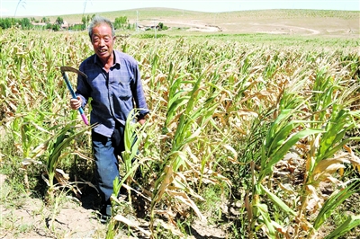 8月20日,內(nèi)蒙古赤峰市巴林右旗查干淖爾鎮(zhèn)61歲的農(nóng)民聶國全在自家的玉米地里“收割”旱枯的秸稈。