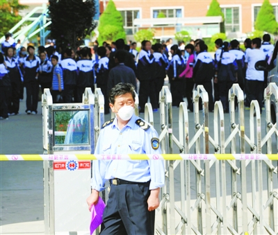 圖為:8月31日,衛(wèi)生部門一名工作人員在發(fā)生甲型H1N1流感暴發(fā)疫情的蘭州某中學(xué)大門外值班。據(jù)甘肅省衛(wèi)生廳通報,截至8月30日15時已確診26例,首例病例8月28日確診。 |