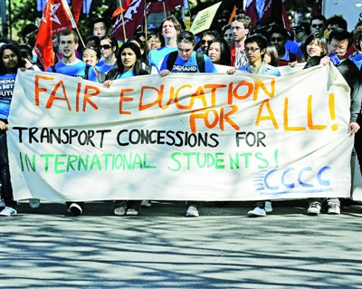 9月2日,在澳大利亞悉尼,留學(xué)生們舉行游行示威,要求公平待遇和安全環(huán)境。這次游行是由澳大利亞全國(guó)學(xué)生聯(lián)合會(huì)、澳中青年交流促進(jìn)會(huì)和印度留學(xué)生聯(lián)合會(huì)等發(fā)起的。澳大利亞目前有外國(guó)留學(xué)生共計(jì)46萬(wàn)人,海外教育產(chǎn)業(yè)已經(jīng)成為澳大利亞第三大創(chuàng)匯產(chǎn)業(yè),每年為澳大利亞帶來(lái)155億澳元的收入,然而私立學(xué)校管理混亂、教學(xué)質(zhì)量較差、學(xué)生打工遭受剝削、安全得不到保障以及移民法隨意更改等問(wèn)題引起留學(xué)生普遍不滿(mǎn)。新華社/法新 |