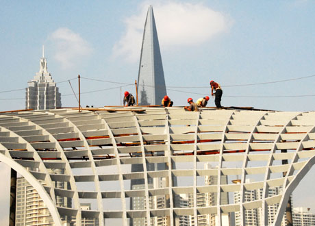 9月7日,工人在上海新十六鋪碼頭的“浦江之云”玻璃天棚上施工。 近日,上海城市景觀新地標(biāo)———新十六鋪碼頭的主體工程完成,玻璃天棚、親水平臺(tái)和駁船碼頭等主體建筑現(xiàn)出雛形,工程進(jìn)入機(jī)電安裝和裝飾施工階段。上海的新十六鋪碼頭計(jì)劃于2010年世博會(huì)前正式投入使用,屆時(shí)將成為上海世博會(huì)的“水上門戶”。