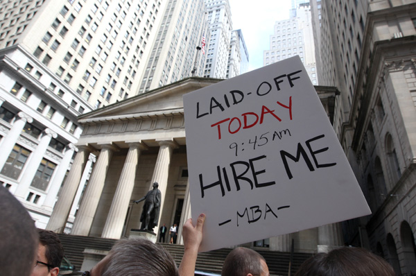 當(dāng)?shù)貢r(shí)間9月14日,在美國(guó)紐約華爾街的聯(lián)邦大廳外,一名失業(yè)者手拿標(biāo)語(yǔ)進(jìn)行抗議。當(dāng)日,美國(guó)總統(tǒng)奧巴馬在華爾街的聯(lián)邦大廳就金融危機(jī)一周年發(fā)表演講。