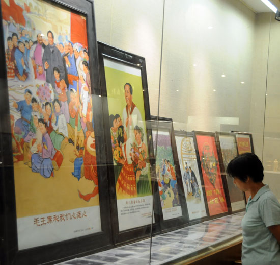 圖為廈門市一位市民在觀看《毛主席和我們心連心》張貼畫等展品。