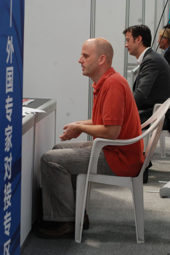 10月11日,在中國無錫人才智力交流大會上,前來應聘的外籍人員與用人單位的代表交談。當天,2009年中國無錫人才智力交流大會在無錫市體育中心開幕,近600家企業(yè)提供1萬多個崗位,吸引了近2萬名求職者進場應聘,其中不乏一些外籍人士前來咨詢。新華社發(fā)