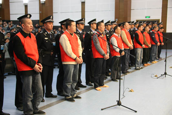 10月12日,楊天慶(左一)等被告人在庭審現(xiàn)場。 當(dāng)日,重慶兩起“涉黑涉惡”案件分別在重慶市第一和第三中級人民法院開庭,31名被告人受審。其中重慶市第一中級人民法院公開開庭審理的是楊天慶等9人“涉黑”案,國家公訴機(jī)關(guān)指控的涉案罪名多達(dá)十項(xiàng),涉嫌犯罪時(shí)間跨越八年。從當(dāng)日起,重慶的“涉黑涉惡”案件將在五個(gè)中級法院陸續(xù)開庭審理。新華社發(fā)