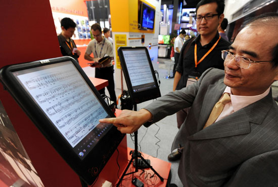 13日,全球最大規(guī)模的電子產(chǎn)品貿(mào)易展覽——第29屆香港秋季電子產(chǎn)品展在香港會議展覽中心開幕,展覽為期四天。本屆展覽共展出2852家參展商的最新電子產(chǎn)品。圖為參觀者正在一展覽會展臺前親手體驗電子樂譜。