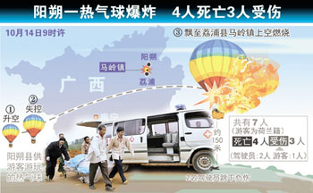 14日6時(shí)30分左右,發(fā)生事故的熱氣球從廣西陽朔縣紅旗碼頭起飛,上面載著2名中國男性駕駛員和5名荷蘭籍游客,游客為3男2女。7時(shí)45分左右飛到荔浦縣馬嶺鎮(zhèn)德安村山面屯上空,在降落過程中,發(fā)生傾斜,熱氣球上的氣瓶發(fā)生漏氣燃燒,熱氣球失控上升,后熱氣球燃燒墜毀,從熱氣球上摔落山坡上的2男2女當(dāng)場死亡,均為荷蘭籍游客。另外掉在樹上的2名中國男性駕駛員和1名荷蘭籍男性游客幸免于難。