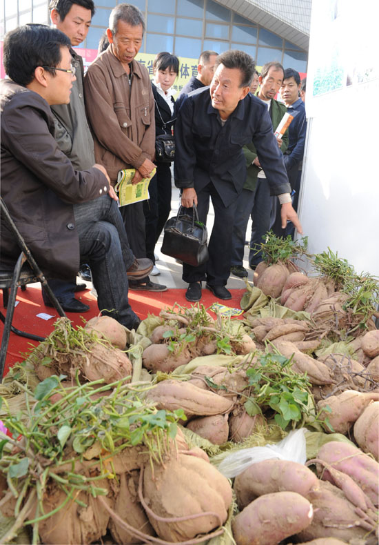 10月21日,第七屆全國(guó)特種養(yǎng)殖種植技術(shù)成果博覽會(huì)在安陽(yáng)舉行,來(lái)自河南省安陽(yáng)市等各地的數(shù)百項(xiàng)農(nóng)業(yè)新產(chǎn)品、新成果在展覽會(huì)上進(jìn)行了展示和交流。 圖為幾名農(nóng)民在博覽會(huì)上了解巨型紅薯的種植技術(shù)。