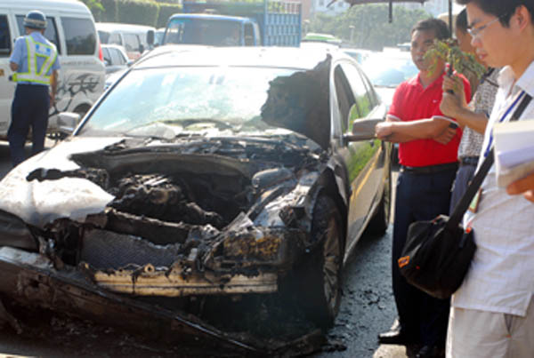 10月30日,一輛寶馬汽車在?诮诸^正常行駛時,突然自燃起火,消防等部門趕到將火撲滅時,車頭已燒毀,直到交警部門將車拖走,受阻近2個小時的交通才得以順暢。據(jù)車主稱,寶馬車未購買自燃保險,自燃事故中無人員傷亡。新華社發(fā)