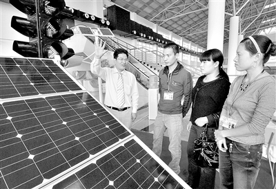 10月28日,采購商在浙江義烏舉行的機(jī)械工業(yè)博覽會上聽取展商工作人員介紹太陽能系列產(chǎn)品。 當(dāng)日,為期三天的2009義烏機(jī)械工業(yè)博覽會在義烏梅湖會展中心開幕,來自各地的1000余家企業(yè)參展。展會上展出的太陽能發(fā)電系統(tǒng)、太陽能交通指示燈、太陽能路燈等綠色環(huán)保能源產(chǎn)品,受到中外采購商青睞。