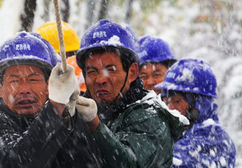 圖為11月16日,安徽省肥西縣供電部門的工作人員冒著大雪在該縣煙墩鄉(xiāng)進行主線路的緊急搶修。