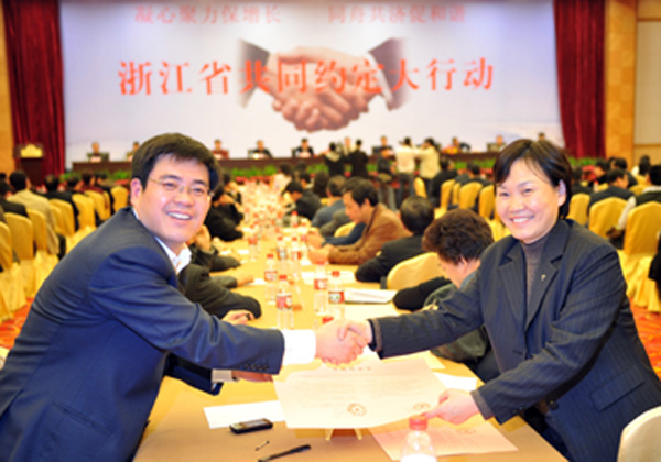 3月19日,來自浙江各地的119家知名國有與民營企業(yè)與本企業(yè)的職工方代表在杭州簽署“共同約定書”,承諾企業(yè)與職工攜手抵御國際金融危機(jī)給企業(yè)和職工帶來的沖擊,展現(xiàn)企業(yè)與職工利益共同體的形象!肮餐s定書”中企業(yè)承諾自覺承擔(dān)社會(huì)責(zé)任,穩(wěn)定就業(yè)崗位,保障職工合法權(quán)益,在經(jīng)營困難期間,做到不裁員或少裁員;職工方承諾與企業(yè)同舟共濟(jì),共渡難關(guān)。遇到問題通過工會(huì)和職工代表大會(huì)等途徑合法解決。本次簽署“共同約定書”的企業(yè)共119家,涉及職工10萬多人。圖為中國電信杭州分公司的企業(yè)方代表(左)和職工方代表(右)在簽署“共同約定書”后握手。