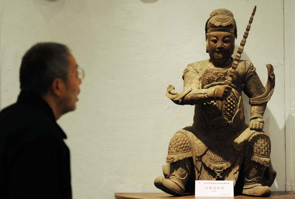 從12月5日開始,長沙首屆民間收藏精品展在長沙市博物館展出。35位民間收藏家的1000余件收藏品通過9個展廳、18個專題展區(qū)來展出,展品包括金銀器、青銅器、陶器、玉石器、漆木器、書畫、家具、古籍拓本等,年代跨度從商代至近現(xiàn)代,其中不少民間珍寶是首次與觀眾見面,令參觀者大開眼界。圖為一位參觀者在參觀明朝“木雕武財神”。