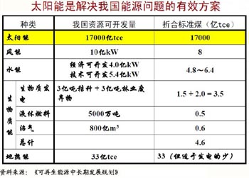 我國陸地表面每年接受太陽能輻射相當(dāng)于49000億噸標(biāo)準(zhǔn)煤,全國2/3的國土面積日照在2200小時以上。如果將這些太陽能全都用于發(fā)電,約等于上萬個三峽工程發(fā)電量的總和。豐富的太陽能資源,是中華民族賴以生存、永續(xù)繁衍的一筆最寶貴的財富。 |