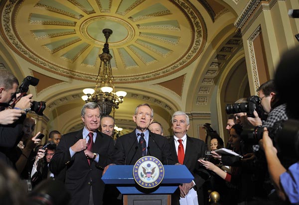 12月24日,美國(guó)國(guó)會(huì)參議員多數(shù)黨領(lǐng)袖、民主黨參議員哈里·里德(中)在投票后出席記者會(huì)。美國(guó)國(guó)會(huì)參議院24日清晨投票通過了美國(guó)總統(tǒng)奧巴馬支持的全面醫(yī)療改革法案。法案的核心是創(chuàng)建一個(gè)聯(lián)邦監(jiān)管的醫(yī)療保險(xiǎn)市場(chǎng),而政府將成立公共保險(xiǎn)機(jī)構(gòu)出售醫(yī)療保險(xiǎn)!⌒氯A社記者張巖攝(詳細(xì)報(bào)道見四版) |