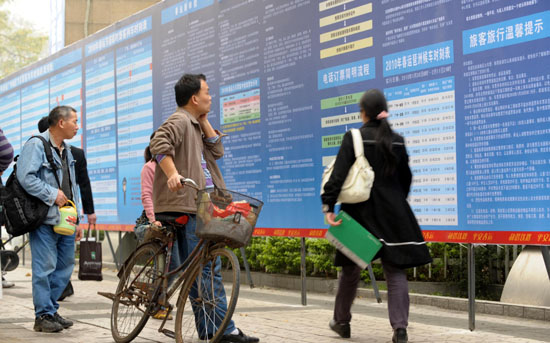 1月20日,群眾在廣州交易會(huì)流花展館春運(yùn)火車票集中售取票點(diǎn)外查看公告欄。 1月21日起,廣鐵集團(tuán)將開售實(shí)名制火車票,其中首張實(shí)名制車票將通過電話訂出。目前,準(zhǔn)備工作已經(jīng)到位。根據(jù)廣鐵集團(tuán)春運(yùn)售票方案,旅客可以通過各火車站售票窗口、鐵路設(shè)立的集中售票處、火車票代售點(diǎn)、電話訂票等四種渠道購(gòu)買實(shí)名制車票,訂票線路和售票窗口數(shù)將達(dá)1萬多個(gè),盡可能方便旅客購(gòu)買春運(yùn)實(shí)名制車票。 |