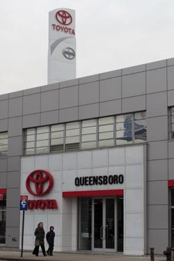 兩名行人從美國紐約的一家豐田汽車專賣店門前走過。新華社記者 劉欣 攝