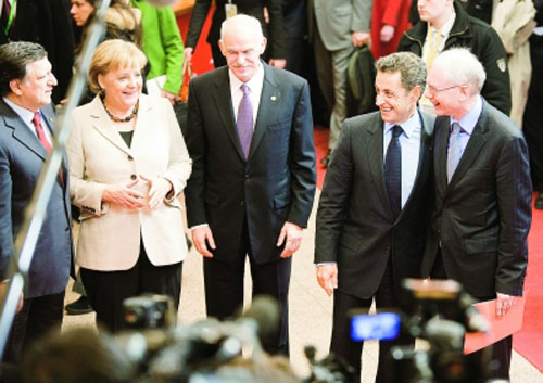 2月11日,(從左至右)歐盟委員會主席巴羅佐、德國總理默克爾、希臘總理喬治·帕潘德里歐、法國總統(tǒng)薩科齊和歐洲理事會常任主席范龍佩在比利時布魯塞爾的歐盟理事會大樓內(nèi)聊天。歐盟領(lǐng)導(dǎo)人11日在布魯塞爾舉行非正式會晤,重點討論希臘政府債務(wù)危機(jī)、未來10年經(jīng)濟(jì)發(fā)展戰(zhàn)略、全球應(yīng)對氣候變化談判和海地災(zāi)后重建。(相關(guān)報道見今日四版)新華社發(fā)