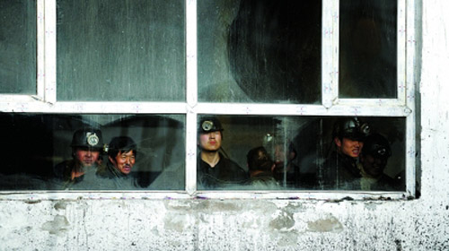 3月1日,幾名礦工在救援現(xiàn)場等待參加救援。