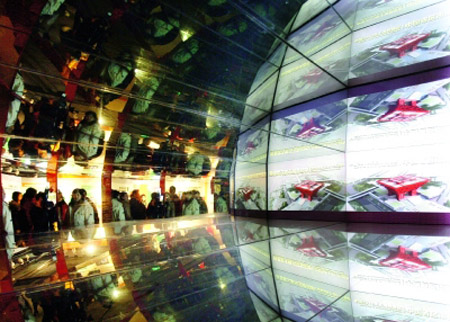 3月9日,游客在上海世博會展示中心內(nèi)通過球幕視頻了解部分世博場館的外觀效果。