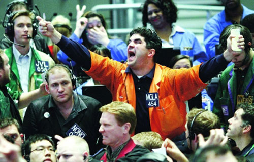 3月16日,一名交易員(中)在芝加哥商品交易所工作。 美國聯(lián)邦儲備委員會(美聯(lián)儲)當(dāng)日宣布,將聯(lián)邦基金利率繼續(xù)維持在歷史最低點的零至0.25%的水平。