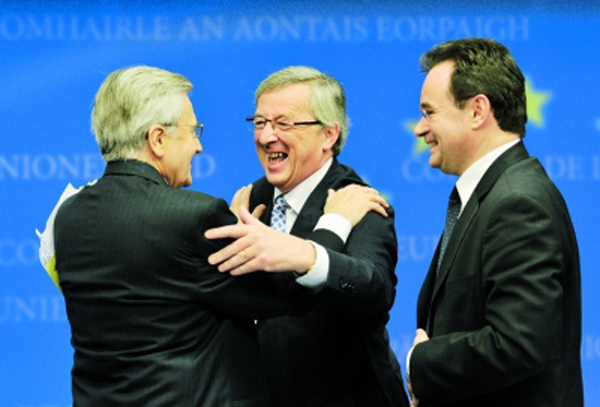 5月2日,在比利時首都布魯塞爾舉行的歐元區(qū)成員國財政部長會議后的新聞發(fā)布會上,歐元集團(tuán)主席、盧森堡首相容克(中)擁抱歐洲央行行長特里謝(左),希臘財政部長帕帕康斯坦季努站在一旁。當(dāng)天,歐元區(qū)財政部長同意在未來的三年內(nèi)為希臘政府提供800億歐元貸款,以幫助陷入債務(wù)危機(jī)的希臘渡過難關(guān)。(詳見今日四版)