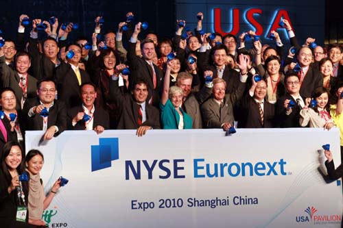 5月20日北京時間21點30分(美國東部時間上午9點30分),美國紐約泛歐交易所集團(tuán)高管與紐約證券交易所部分上市公司代表在上海世博園美國館前搖響小鐘,為紐約證券交易所遠(yuǎn)程開市。當(dāng)日,美國紐約證券交易所在上海世博園美國館和位于紐約的交易所交易大廳內(nèi)同步舉行開市儀式!
