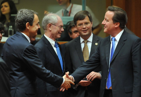 6月17日,在比利時首都布魯塞爾,(從左至右)歐盟輪值主席國西班牙首相薩帕特羅、歐洲理事會常任主席范龍佩、荷蘭首相巴爾克嫩德歡迎首次參加歐盟首腦會議的英國首相卡梅倫。 歐盟成員國領(lǐng)導人17日在布魯塞爾召開會議,重點討論歐盟未來10年經(jīng)濟發(fā)展戰(zhàn)略和加強歐盟經(jīng)濟治理,試圖著眼長遠避免債務危機重演!