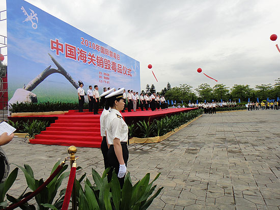 | 海關(guān)總署25日上午在廣東虎門舉行儀式,銷毀全國(guó)海關(guān)近年來(lái)查獲的上噸走私毒品。圖為現(xiàn)場(chǎng)四周警察嚴(yán)陣以待。 |