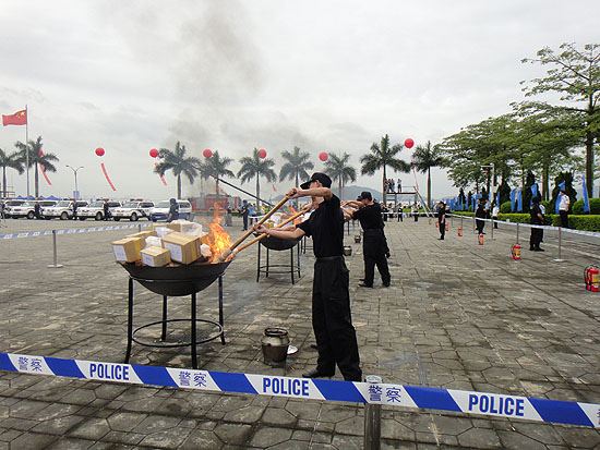 | 海關(guān)總署25日上午在廣東虎門舉行儀式,銷毀全國(guó)海關(guān)近年來(lái)查獲的上噸走私毒品。圖為海關(guān)關(guān)員執(zhí)行銷毀毒品的點(diǎn)火任務(wù)。 |