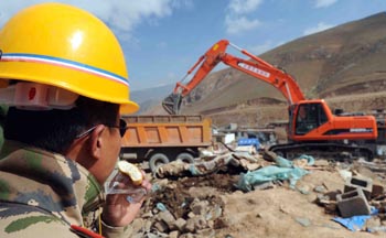 武警水電部隊(duì)官兵在結(jié)古鎮(zhèn)利用大型機(jī)械清運(yùn)建筑廢墟。新華社記者 侯德強(qiáng)