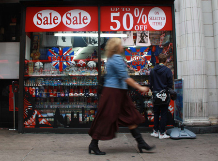 7月13日,在英國(guó)首都倫敦,一名婦女從正在降價(jià)促銷的旅游禮品店前走過(guò)。 據(jù)英國(guó)國(guó)家統(tǒng)計(jì)局當(dāng)天公布的最新數(shù)據(jù),由于暑期商品打折季的開始和汽油價(jià)格的下調(diào),英國(guó)6月份的消費(fèi)者物價(jià)指數(shù)由五月的3.4%下降到3.2%,但仍然高于英格蘭銀行制定的通貨膨脹率2%的目標(biāo)。