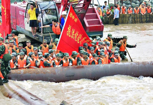 7月18日,南京軍區(qū)某部官兵在南京高旺河決堤處封堵決口。