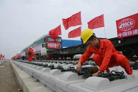 7月19日,中國鐵建的施工人員正在鋪軌機(jī)前作業(yè)。 當(dāng)日,隨著中國鐵建十四、十五局集團(tuán)的鋪軌機(jī)在徐州東站平穩(wěn)地鋪下一段500米長鋼軌,標(biāo)志著世界上一次建成線路最長、標(biāo)準(zhǔn)最高、新中國成立以來一次投資規(guī)模最大的高速鐵路鋪軌正式啟動(dòng)。全長1318公里的京滬高速鐵路,從北京南站出發(fā)終止于上海虹橋站,總投資2200億元。預(yù)計(jì)今年年底完成鋪軌,2012年前建成通車后,旅客即可以踏上京滬4小時(shí)“陸地飛行”之旅。 |