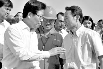 新疆維吾爾自治區(qū)黨委書記張春賢(左)告訴蔣潔敏(右):“中國石油對(duì)新疆發(fā)展提出的總體規(guī)劃令人鼓舞!崩钚旅