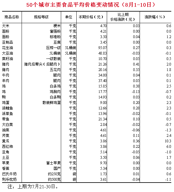 國(guó)家統(tǒng)計(jì)局16日公布《50個(gè)城市主要食品平均價(jià)格變動(dòng)情況(8月1-10日)》顯示,8月上旬,部分蔬菜價(jià)格出現(xiàn)明顯上漲。其中,黃瓜價(jià)格比7月下旬(下同)增長(zhǎng)10.3%,西紅柿價(jià)格上漲6%。 數(shù)據(jù)表明,肉蛋價(jià)格穩(wěn)定回升。散裝鮮雞蛋價(jià)格上漲2.3%至每千克9元。豬肉后臀尖(后腿肉)和五花肉價(jià)格分別上漲2.0%和1.8%。