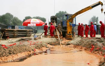 塔輪天然氣管道復(fù)線成功穿越中國最長內(nèi)陸河。施工人員正在現(xiàn)場作業(yè)(8月8日攝)。新華社發(fā)(陳士兵
